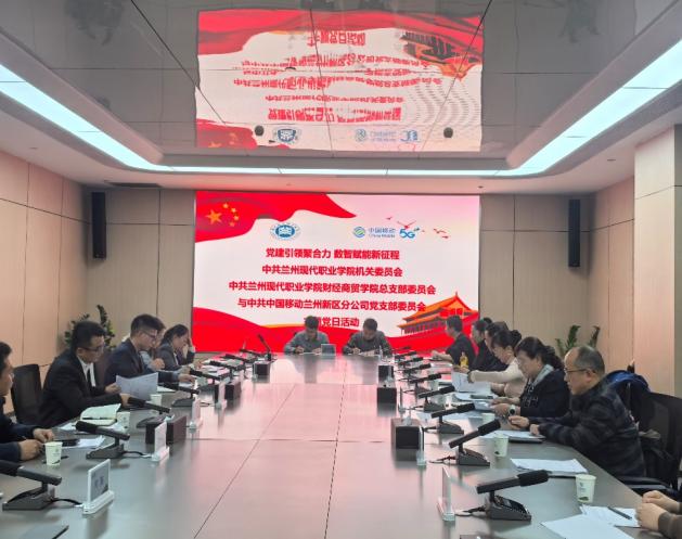 为深入学习贯彻党的二十届四中全会精神,扎实推动党建与业务深度融合,持续深化产教协同育人机制,12月5日,在学院机关党委精心统筹下,财经商贸学院教师第一、第二党支部、兰州市商业学校第二党支部与兰州移动公司新区党支部,共同举办以“党建引领,5G赋能:探索智慧教育新路径”为主题的联合党日活动。活动以高质量党建为引领,聚力推动职业教育与数字技术协同发展,为产教融合注入新活力。