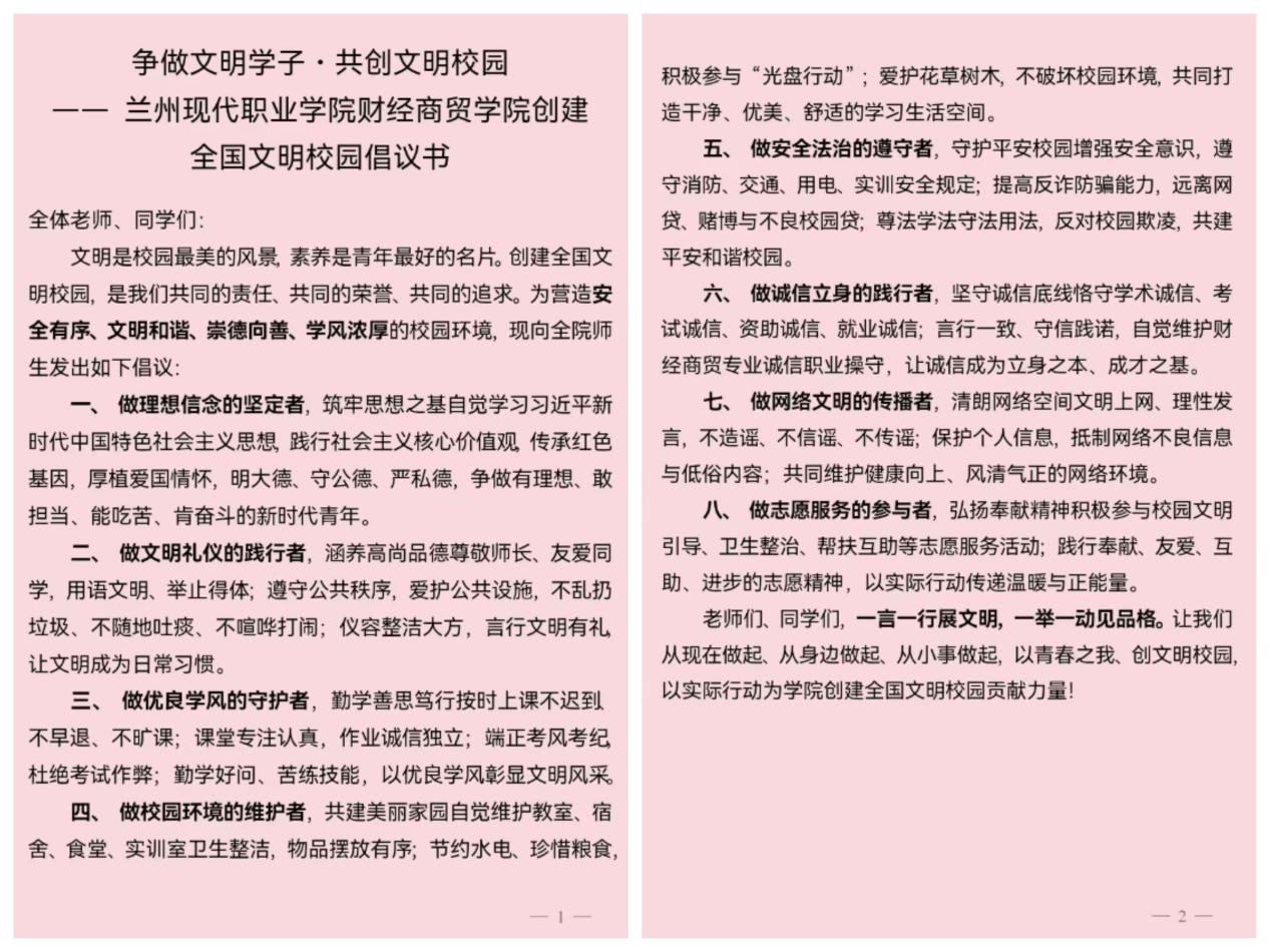 为深入贯彻落实兰州现代职业学院关于创建全国文明校园的工作部署,财经商贸学院紧紧围绕“六个好”创建标准,以“争做文明学子共创文明校园”为主线,坚持思想引领、知行合一,进一步将文明校园创建成效转化为学院高质量发展的精神动力。