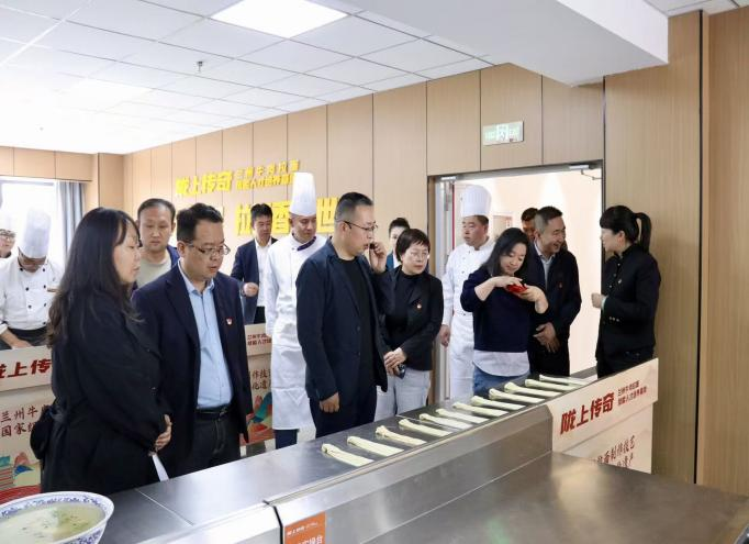 全体人员依次参观了基地实训场地、文化展示区与大师工作室,深入了解兰州牛肉拉面产业发展、技能人才培养及技艺传承成果。在技能展示与互动体验环节,技能大师现场演示拉面、烹饪技艺,党员代表亲身体验拉面制作过程,近距离感受执着专注、精益求精的工匠精神与技能魅力。