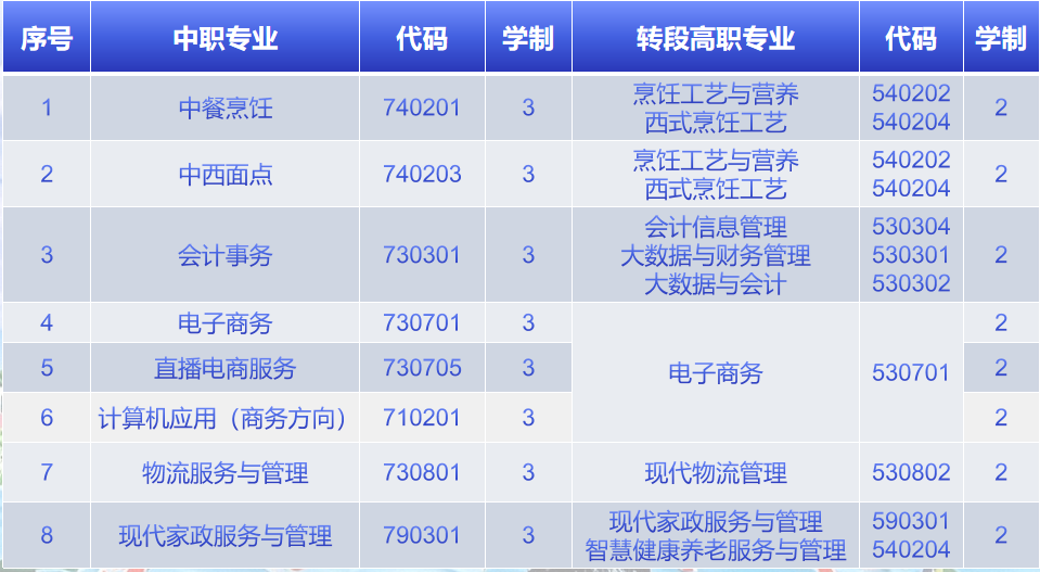学校实行“3+2”中高职贯通培养模式,即在中职学习三年后,在无挂科、无违纪处分、参加转段考试进入兰州现代职业学院或其他高职院校(甘肃财贸职业学院、甘肃农业职业技术学院、甘肃畜牧工程职业技术学院、甘肃有色冶金职业技术学院、庆阳职业技术学院)进行高职阶段学习。
